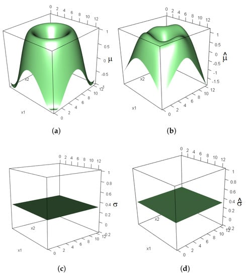 The true surface and local spatial patterns of the location parameter (Figure 2a) that were used to simulate the extreme values were recovered reasonably well by the smoothing function (Figure 2b). Similarly, a comparison of Figure 2c,d reveals that the smoothing function for the scale parameter of the extreme values based on the model given in Equation (1) recovered the true flat function for given in Equation (5).