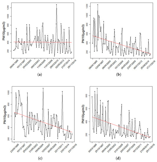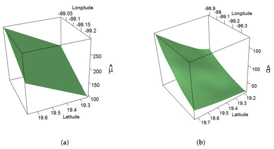 Evidently, the extreme values of vary over time and from area to area because of local conditions, such as the topographic setting or the local wind. This fact justifies the modeling of the location parameter with respect to time and space. We verified this behavior by means of the estimates presented in Table 3, which show that the magnitudes of the studied maxima tend to decrease over time. Similarly, the boxplots in Figure 4 show that the distribution of the maxima is not the same in all monitored locations; therefore, a suitable model for the maxima must include temporal and spatial variations and their possible interactions. One of the strengths of our study is that the proposed model implicitly includes interactions between covariates, whereas most models consider only the main effects through additive or linear functions.