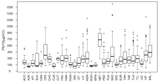 Figure 4 shows boxplots of the maxima at each of the 31 monitoring stations considered in the study. The sites with lower maxima, less than 151 g/m on average, are located in MGH = Miguel Hidalgo, MPA = Milpa Alta, AJM = Ajusco Medio and CUA = Cuajimalpa. Relatively well-preserved areas can still be found at these sites, which also have the lowest industrial activity and urban growth in the study area. By contrast, we also found sites with more than 723 g/m on average, such as NET = Netzahualcoyotl, XAL = Xalostoc, CES = Cerro de la Estrella and MER = Merced, which are characterized by high industrial activity and heavily traveled paved and unpaved roads with heavy vehicular traffic [6].