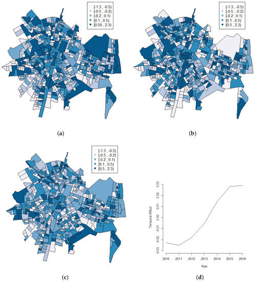 (a–c): spatial effect for the years 2010, 2013 and 2016, respectively; (d): temporal effect during the period (2010–2016).