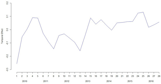 Again, results in Table 4 show a higher effect of the heterogeneity parameter () compared to the spatial structured term (), as well as a strong relevance of the autoregressive term ( is around 0.9). However, more importantly, the temporal term (without the quarterly effect) now becomes more relevant, shown by a higher value of the autoregressive standard deviation . The resulting temporal effect () presented at Figure 4 clearly shows a different behavior (increasing trend but with more ups and downs) than the one observed at Figure 3d.