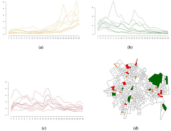 Changes in relative risks for three kind of census block groups in the city of Valencia. (a): Relative risks of census block groups with an increasing trend; (b): Relative risks of census block groups with a decreasing trend; (c): Relative risks of census block groups with permanent high risk; (d): Changes in relative risk: location of the selected census block groups in the city of Valencia (in orange those with an increasing trend, in green those with a decrease in the tendency, and in red those where the relative risk was always high).