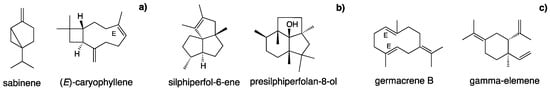 Thirty-five volatile compounds, all belonging to the sesquiterpene class (94.3%), were identified in the root essential oil from E. giganteus (54.7% sesquitepene hydrocarbons and 39.6% oxygenated sesquiterpenes). The major compounds were tricyclic sesquiterpenoids, which are characterized by multiple rearrangements of the caryophyllene cation [,], namely, silphiperfol-6-ene (23.0%), presilphiperfolan-8-ol (22.7%), presilphiperfol-7-ene (7.8%), and cameroonan-7-α-l (7.8%). Another noteworthy constituent occurring in the oil was (E)-caryophyllene (6.3%). The cameroonan-7-α-l, is responsible for the patchouli-like smell of the root oil []. The reported composition was quite consistent with that previously reported by Menut et al. [] for root samples collected in Cameroon.