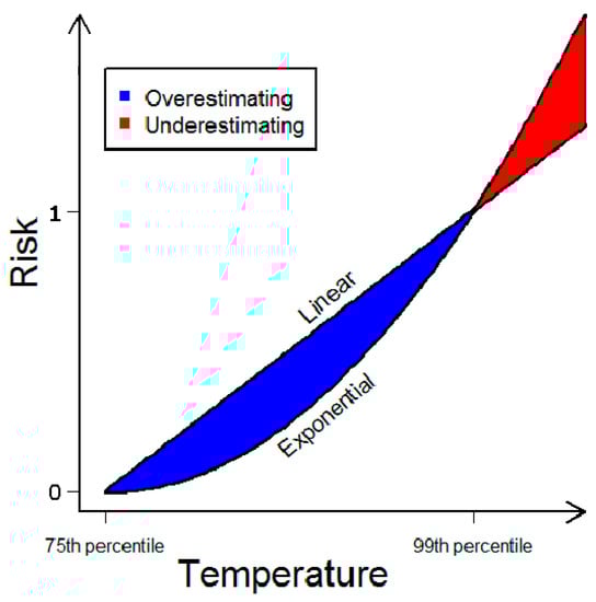 The difference between using a linear and an exponential relationship to describe heat-related mortality, assuming that the exponential relationship is the correct one.