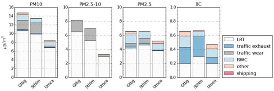 18], the relative impact of traffic exhaust increases significantly. For Stockholm, the percentage of the premature deaths caused by local sources that are related to “traffic < 2.5 µm” is estimated to 66% when using BC as an indicator and around 40% using PM