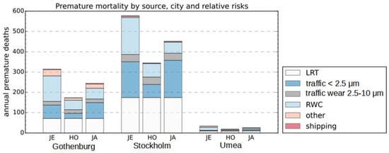 2.5. In Umea RWC represents 40–60% of the premature deaths due to local sources. For Gothenburg and Stockholm, RWC is somewhat less important and represents 20–50% of the premature deaths related to local sources. In