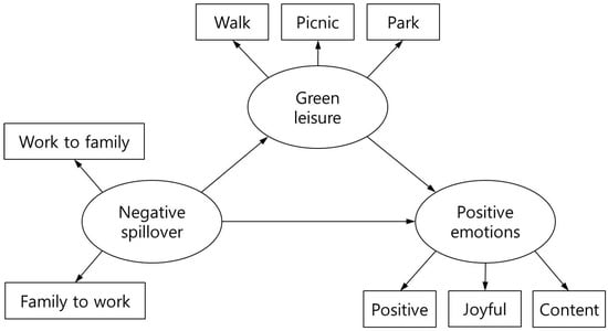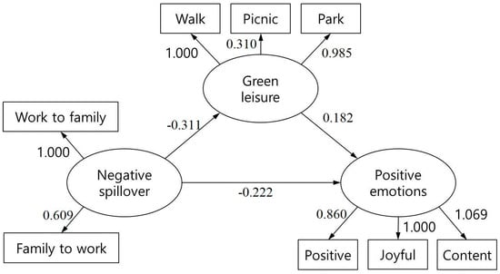 All variables exhibited mutual relationships (Table 2), which is consistent with the literature. For example, leisure activities in green spaces were negatively correlated with both items of negative spillover (i.e., negative work–family spillover and family–work spillover), and when an individual experiences more negative spillover between work and family, the individual’s participation in leisure activities in green spaces is lower, and vice versa. In addition, negative spillover and positive emotions were negatively correlated, meaning that if an individual experiences a higher level of negative spillover between work and family, the individual experiences a lower level of positive emotions. Moreover, the frequency of participation in leisure activities in green spaces exhibited a positive correlation with positive emotions; in other words, individuals who participate in more leisure activities in green spaces experience more positive emotions.