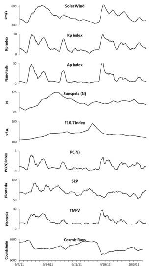 - Stoupel, E.; Abramson, E.; Israelevich, P.; Sulkes, J.; Harell, D. Dynamics of serum c-reactive protein (CRP) level and cosmophysical activity. Eur. J. Int. Med. 2007, 18, 124–128. [Google Scholar] [CrossRef] [PubMed]