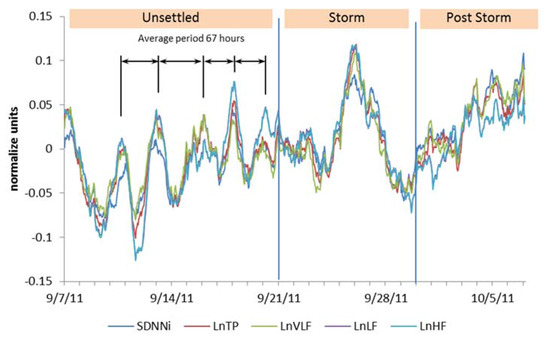 An intriguing and surprising finding was the slow wave synchronization in the group averaged HRV data (SDNNi, TP, VLF, LF, and HF). A clear pattern of oscillations with an average period of 67 h (standard deviation (SD), 16.8 h) was observed during the first half of the study period (Figure 2). The arrows in the unsettled period indicate the varying time between the sine wave-like peaks in the oscillations of the slow wave HRV rhythm. This finding suggested that even though the participants were located at different locations, they were all synchronizing to external environmental signals with a similar oscillatory period.