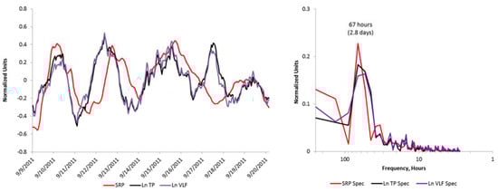 To explore the data for the possibility that an external environmental signal may be influencing the HRV measures, we isolated the 11-day period with this clear oscillatory pattern, and examined the correlations between the SDNNi, the TP, and VLF, LF, and HF power waveforms and the environmental signals. Significant correlations were found between SRP and all five of the HRV measures. The SRP correlation with TP and VLF were the strongest (r = 0.46, p < 0.01 for both). An overlay chart and frequency spectrum of the three signals is shown in Figure 3, along with the frequency spectrum, which confirms that the primary peaks of these slow wave signals are oscillating at the same frequency.