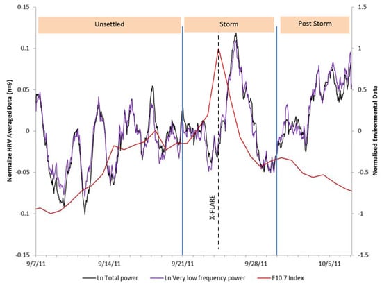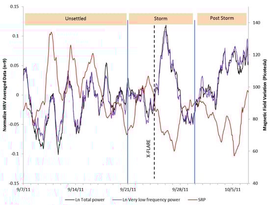 Figure 4 shows an overlay of the HRV indices of VLF and total power and the Schumann resonance power across the 31-day period. The positive relationship can clearly be seen in the first 14 days of the study period up until the time of the strong X1.9 category CME that occurred on 24 September, which was accompanied by an extreme ultraviolet flash, X-ray burst, and a large peak in the solar radio flux (F10.7) index. During the magnetic storm and post-storm periods, the SRP dropped. The HRV during the storm appeared to be responding to other environmental factors during these periods. At the end of the post-storm period, the SRP began to recover. As can be seen in Figure 5, after the CME occurred there was an immediate increase in solar radio flux, which occurred at the same time as the X-class solar flare (dashed line), then declined over the post-storm period to nearly the same level as it was at the beginning of the study period. There was a steep increase in the group’s HRV following the increased solar radio flux, which rapidly declined in conjunction with the sharp jump in SWS on 26 September (Figure 6) and the beginning of the severe magnetic storm at approximately 12:15 universal time on 26 September (NOAA Kp index of 8). The Goddard Space Weather Lab reported a “strong compression of Earth’s magnetosphere”. Shortly after the start of the severe magnetic storm disturbance, the clear rhythm seen in the first two weeks of the SRP and the group’s HRV rhythm were disrupted. The positive relationship between the SRP and HRV became negative during the time of the disturbance, as discussed above. Once the magnetic field disturbance passed, the group’s HRV rhythms began to resynchronize in a similar pattern as the one seen in the first two weeks of the study period.