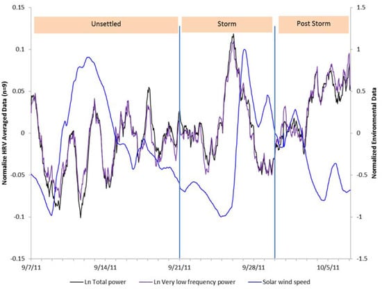 HRV total power and very low frequency power measures with solar wind speed variations overlaid.