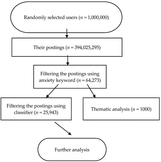 All postings that contained the keyword “焦虑” (anxiety) were retrieved from the 394,025,295 postings. The number of the selected anxiety-related postings was 64,273 (i.e., 0.02%). The reason for not including other anxiety-related words, such as “害怕” (fear), “担心” (worry), and “恐怖” (phobia), was that these words were not anxiety-specific enough, and including them would introduce too much noise.