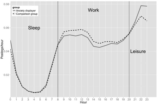The difference between two groups on distribution of postings was statistically significant. Figure 3 presents the diurnal pattern of the posted messages by the users displaying anxiety and comparison users, indicating that the general population was more active during work time than users with anxiety. In contrast, the anxiety displayers were more active during leisure time. There was only a slight difference in activity level between the two groups during sleep time.