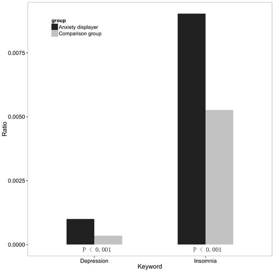 Previous studies have shown that the people who suffer from anxiety may also be bothered by depression and insomnia, so we attempted to determine whether an association between anxiety and insomnia could be found using the social media data. We collected all the postings posted by the anxious users and counted the number of the postings that contained the keyword “抑郁” (depression), “睡不着” (can’t fall asleep) or “失眠” (insomnia). For comparison purposes, we calculated the proportions of the comparison group’s postings that contained the same keywords. Pearson Chi-square tests were employed to determine whether the difference between users displaying anxiety and typical users on the frequency of specific keywords is statistically significant. p < 0.05 was considered statistically significant.
