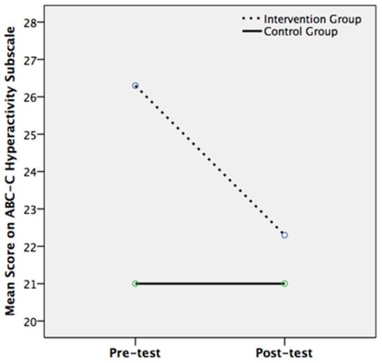 | Hyperactivity | 26.30 | 10.73 | 22.30 | 9.67 | −4 | 1.68 | 21 | 11.07 | 21 | 11 | 0 | 0.15 | 8.084 | 0.009 ** | 0.518 |