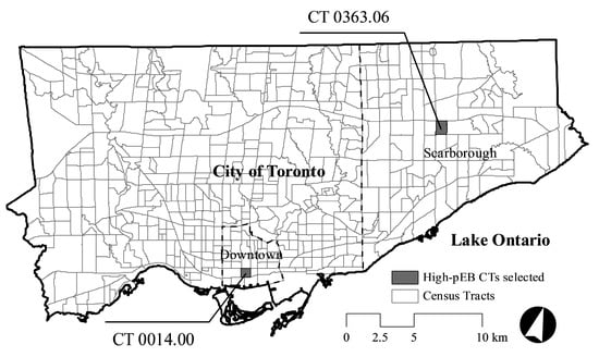 Two CTs met the selection criteria: 0014.00 (hereafter referred to as Downtown); and 0363.06 (hereafter referred to as Scarborough). Characteristics and locations of selected CTs are presented in Table 1 and Figure 1, respectively.