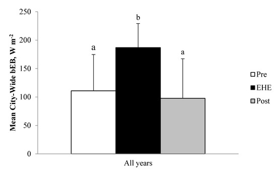 The bEBs, collated across four separate EHEs from 3 different years and across the range of the hot season, are very similar to those reported by Vanos et al. [22] for a 3–5-day EHE in Toronto in July 2005. This is true both for absolute values by period (i.e., Pre, EHE, and Post) and for the ~80 W m−2 increase in bEB during the EHE period, as compared to both Pre and Post.