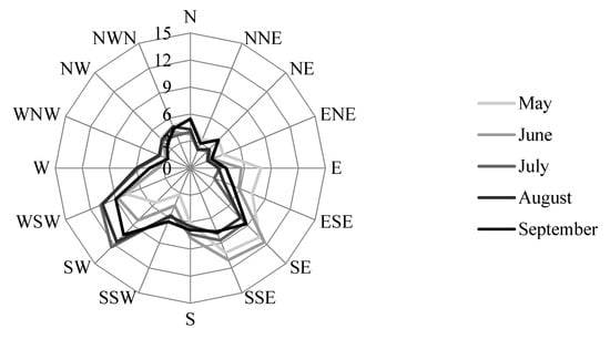Wind patterns in sunny conditions are of particular interest for designing cooling microclimates. From May to September, typical wind during sunny conditions most often flows from either the SE–SSE or the SW–WSW directions (Figure 3). The SE–SSE direction is more predominant during May and June and the SW–WSW direction is more predominant from July–September. However, designing for a cool microclimate should consider all warm months. On average, from May–September, sunny condition winds are from the SE–WSW 50% of the time. Leaving this range of directions unobstructed would maximize wind flow during summertime sunny conditions.