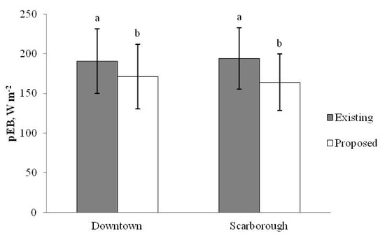 Mean daily (11h00–18h00) pEB on EHE days calculated using the master plans of Downtown and Scarborough before (Existing conditions, grey bars) and after (Proposed conditions, white bars) “cooling” re-design. Data are mean ± SD. Letters “a” and “b” represent comparisons between Existing and Proposed designs within CT, where different letters indicate p < 0.0005 for master plans of Existing vs. Proposed conditions (within-CT, by paired t-test).