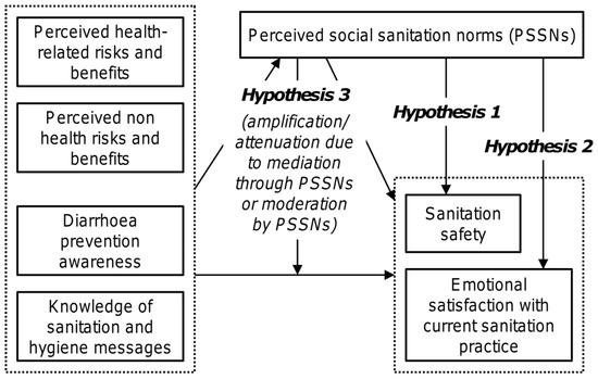 Figure 2 schematically outlines three hypotheses described below and examined in this study. The first one represents a conventional view that considers PSSNs to be a strong direct determinant of sanitation safety (Hypothesis 1). However, we additionally assume that PSSNs may also influence sanitation safety through other routes. As the second hypothesis, we propose that an indirect effect may lead through the effect of PSSNs on one’s emotional satisfaction within the current sanitation situation. Unlike material satisfaction driven by latrine performance and attained sanitation safety, emotional satisfaction is independent of the attained level of sanitation safety and can emerge because of social conformity itself. Emotional satisfaction is known to be associated with false positives [43]. Therefore, in this context, it would mean a potentially adverse feedback effect undermining further upward shifts in the sanitation ladder. This may be an issue especially when a new fixed-point sanitation practice is introduced through persuasive/normative interventions which place the effect of social conformity at the centre in infrastructure-restricted settings characterized by the generally low quality and non-durability of sanitation facilities. Accordingly, the second hypothesis examined in this paper thus analyzes the relationship between PSSNs and the degree of satisfaction with one’s current sanitation practice when the level of current sanitation safety is controlled (Hypothesis 2).