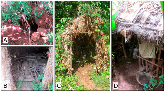 Examples of surveyed sanitation facilities: (A)—Unimproved pit, no other facilities; (B)—Simple slab platform, squatting hole covered; (C)—Pit latrine with solid slab, basic superstructure, apparent footpath; (D)—Pit latrine with solid slab, superstructure ensuring privacy, water and ash available for handwashing.