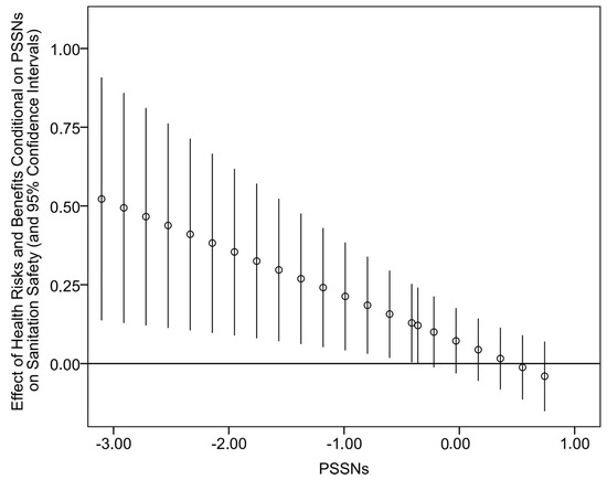 The regression results for the predictors of sanitation safety appear in Table 3. For the sake of readability, Table 3 only contains regression estimates for our focal independent variables. The full specification of the main effects model with estimates for control variables can be found in Appendix A, Table A2. The results presented in Table 3 show that the considered predictors of sanitation safety explain around 40% of variation, which is a good explanatory power given the assumed complexity of sanitation safety determinants. Importantly, a great deal of this variation can be attributed to our focal independent variables (we noted that the main effect model without the focal independent variables explained only around 15% of variation). Congruently with Hypothesis 1, PSSNs were identified (p < 0.01) as the comparatively strongest predictor of sanitation safety. The main effects of other focal independent variables were also positive and statistically significant with the exception of perceived health-related risks and benefits. The examination of separate regression models that included particular two-way interactions between PSSNs and other independent variables revealed that PSSNs moderate the effect of perceived health-related risks. The interaction term was negative (p < 0.01), and a more nuanced look at this conditional relationship showed that it is statistically significant for 27% of all observations with the level of PSSNs below 0.407. A graphical visualization of the conditional relationship appears in Figure 4. Despite the restricted region of significance, these results suggest that PSSNs tend to buffer the (already low) influence of the perception of health-related risks and benefits on the level of sanitation safety of households.