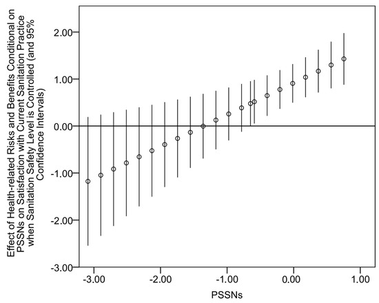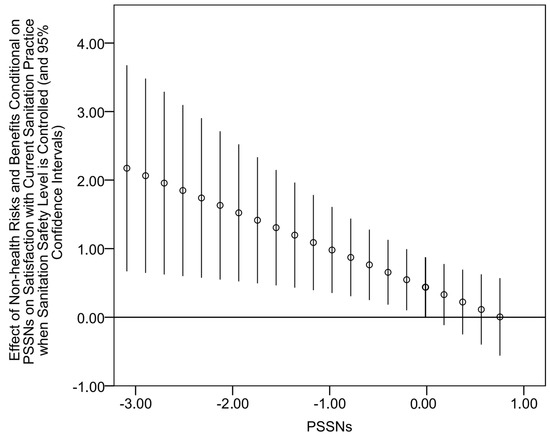 Table 4 presents results for the predictors of satisfaction with current sanitation practice (the full specification of the main effects model with estimates for control variables can be found in Appendix A, Table A3). It also reports regression estimates for the measure of sanitation safety. Although here it was primarily considered as a control variable, its respective beta coefficient is high and positive (p < 0.01) which confirms the importance of attained sanitation safety for satisfaction with current sanitation practice. Unlike other independent variables of interest, PSSNs and perceived health-related risks also revealed significant positive effects on satisfaction with current sanitation practice (p < 0.01) when the level of sanitation safety was held constant. It suggests that these two variables enhance the emotional aspect of satisfaction. Moreover, their mutual interaction term was also statistically significant (p < 0.01) and positive. More specifically, the conditional effect was statistically significant for 79% of observations with PSSNs above −0.641 (Figure 6). These results mean that PSSNs tend to amplify the effect of perceived health-related risks and benefits on emotional satisfaction with current sanitation situation. By contrast, the interaction between PSSNs and perceived non-health risks and benefits was negative suggesting that PSSNs weakens the effect of the latter. This conditional effect was significant at the 95% level for observations with PSSNs below −0.020 (Figure 7). Finally, two variables of factual sanitation-related knowledge were found unrelated to satisfaction with current sanitation practices.