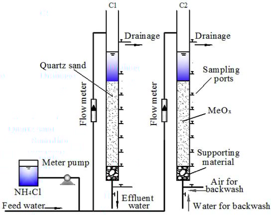 The filter columns were made of two identical plexiglas tubes with an inner diameter of 100 mm and the active filter beds fixed in the filter columns were 120 cm (Figure 1). In filter column C1, the filter bed was virgin quartz sand for use as a blank control. In filter column C2, the active filter bed consisted of MeOx-coated sand formed in the continuously-operated groundwater filter system. The diameters of both the MeOx-coated sand and virgin quartz sand were 1–2 mm. The feed water for this filter system was the treated water coming from a sedimentation tank. First, NH4Cl (Kemiou Co., Ltd., Tianjin, China) stock solution was added to the feed water to adjust the ammonium concentration. Then, the synthesized water was treated by a MeOx filter.