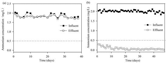 Figure 2a shows that the ammonium removal efficiency of the normal quartz sand filter was always lower than 10% during 40 days of operation. Figure 2b gives an overview of ammonium removal performance in surface water using the MeOx filter for about 47 days for surface water treatment. In the first 10 days, the effluent ammonium concentration was a bit higher, but still below 0.5 mg/L. After operating for about 10 days, the average ammonium concentration in the effluent stabilized was lower than 0.1 mg-NH4+-N/L and the removal efficiency was higher than 90%. This performance was comparable with the ammonium removal from groundwater at 18–21 °C (Figure S1). It was demonstrated that the MeOx filter system, established from the groundwater water treatment plant, is applicable for the almost immediate removal of ammonium from surface water, even though there were remarkable differences in water qualities between the surface water and groundwater (Table 1). However, an accommodation time of 3–4 weeks is required for the traditional biofilter system [].