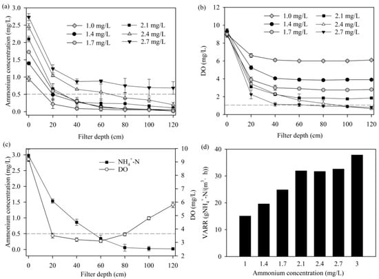 Figure 3d shows that the volumetric ammonium removal rate (VARR) of MeOx at 0–40 cm filter depth increased noticeably when the influent ammonium concentration was increased from 1.0 mg/L to 2.1 mg/L, and changed slightly when the influent ammonium concentration further increased up to 2.1–2.7 mg/L. The VARR of MeOx at 0–40 cm filter depth increased again when compressed air was forced into the filter (at an ammonium concentration of 3.0 mg/L). It suggests that the ammonium removal efficiency of the MeOx was affected by the ammonium concentration when the concentration was below 2.1 mg/L and was limited by DO concentration when the ammonium concentration was above 2.1 mg/L.