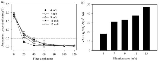 As shown in Figure 4a, the depth profiles of ammonium concentration increased slightly and effluent ammonium concentrations were lower than 0.2 mg/L when the filtration rates increased from 4 m/h to 13 m/h. The VARR of MeOx at the 0–40 cm filter depth was increased by 1.59 times when the filtration rates were increased from 4 m/h to 13 m/h (Figure 4b). This suggests that ammonium removal from the MeOx filter was probably mass-transfer limited [].