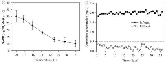 The experimental results showed that the SARR would decrease with decreasing temperature (Figure 5a). In the temperature range of 13–16 °C, the average SARR was 18.18–23.26 mg-NH4+-N/(kg h) (mg-NH4+-N per Kg of MeOx-coated sand per hour) and it was decreased by 43.89–56.34% at 6 °C, which was the lowest surface water temperature at the study site. However, pilot-scale experimental results indicate that ammonium could still be reduced to less than 0.5 mg/L and the average ammonium removal efficiency was still up to 90.6% at the temperature of 6–8 °C (Figure 5b). A previous study proposed that only 10–40% of ammonium was removed at 4–10 °C in a pilot-scale biological filter []. It indicates that MeOx could remove ammonium better than traditional biological processes at low water temperature.
