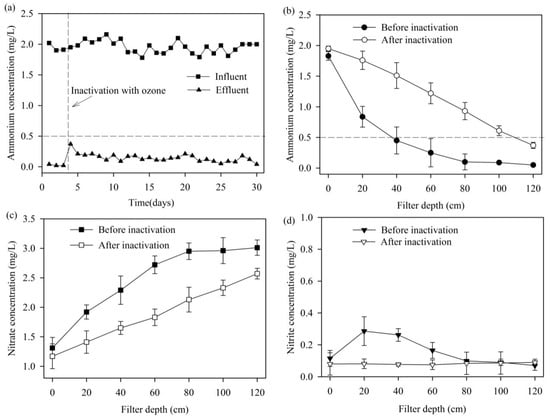 Ammonium removal performances of the MeOx filter before and after inactivation: (a) influent and effluent ammonium concentrations, (b) ammonium, (c) nitrate and (d) nitrite concentration depth profiles.