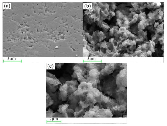 SEM images of (a) normal quartz sand magnified 5000 times, (b) MeOx magnified 5000 times, and (c) MeOx magnified 10,000 times.