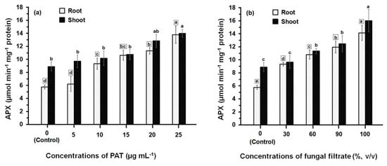 Data presented in Figure 2 illustrate the APX activity of root and shoot of maize seedling following treatment with PAT (Figure 2a). The APX activity was gradually increased upon increasing the concentrations of PAT. This increase in APX activity was significant (p ≤ 0.05) in root tissues treated with PAT concentration starting with 10 μg·mL−1 onwards, where as in shoot tissues, the significant increase in APX activity was obtained at the higher PAT concentrations (20 μg·mL−1 and 25 μg·mL−1). The APX activity measured either in root or shoot treated with 25 μg·mL−1 exceeded 2.40- and 1.57-fold more than those measured in their respective controls. Data further showed that APX activity was lower in root than shoot and significant differences (p ≤ 0.05) in the APX activities were obtained at all PAT concentrations except at 15 μg·mL−1 and 25 μg·mL−1. Similarly to the effect of PAT on the APX activity, treating the root and shoot with culture filtrate of P. vulpinum showed an increase in the enzyme activity which was dose-related (Figure 2b). Meanwhile, the activity resulting from either treatment of root or shoot with the different concentrations of culture filtrate was relatively higher than those resulting from treatment with PAT concentrations. The concentrated fungal filtrate (100%, v/v) stimulated the APX activity in root 2.6-fold and in shoot 1.8-fold, when compared with the respective controls. It was also obvious that the enzyme activity was greater in shoot than in root, and significant differences (p ≤ 0.05) were obtained at 100% fungal filtrate.