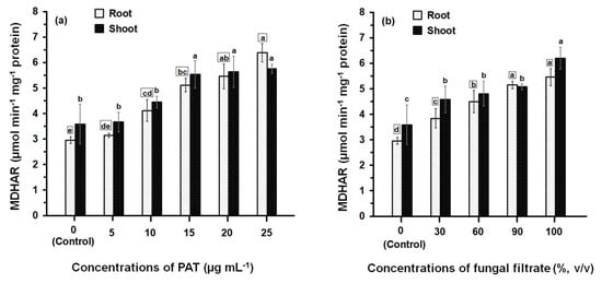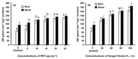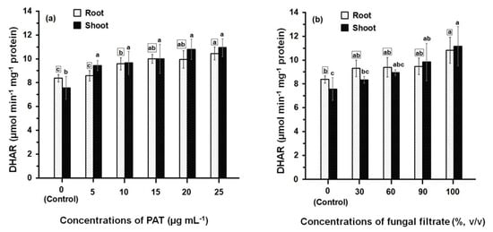 Comparison of the DHAR activities of PAT- and fungal filtrate-treated root and shoot (Figure 4) shows that the enzyme activities in all treatments are always significantly greater than control. However, the difference in DHAR activity amongst concentrations of both PAT (Figure 4a) and fungal filtrate (Figure 4b) was relatively small. At 25 μg·mL−1 (the higher PAT concentration), the recorded DHAR activity in root and shoot was 10.45 ± 0.55 μmol·min−1·mg−1 and 10.94 ± 0.75 μmol·min−1·mg−1 protein, respectively; which increased 1.24- and 1.45-fold of their control treatments. Similar activities of DHAR were obtained the concentrated fungal filtrate (100%, v/v), where the DHAR activity in root and shoot increased 1.30- and 1.48-fold, respectively; as compared to control treatments. Results further indicated that similar DHAR activities were obtained when comparing the enzyme activities of root and shoot at different treatments of PAT and fungal filtrate.