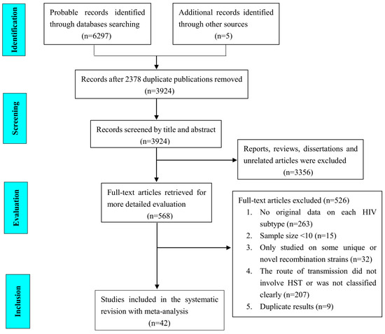 On the basis of our established criteria, for each accepted study, the following information were collected: name of the first author, year of publication, study period, geographical locations of the studies, study method to classify the different HIV-1 subtypes, number of successfully identified HIV-1 subtype samples and the frequency or proportion of each HIV-1 subtype through HST. Data was independently extracted from all of the included studies by two investigators, and any discrepancies in data extraction or eligibility assessment were discussed and resolved before reaching a consensus.