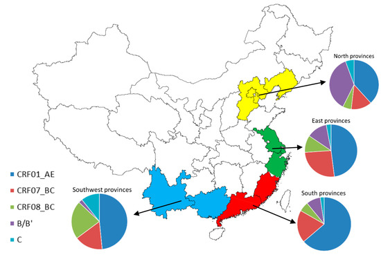 Proportion of HIV-1 subtypes via HST in different geographical provinces.