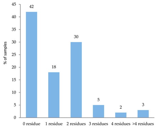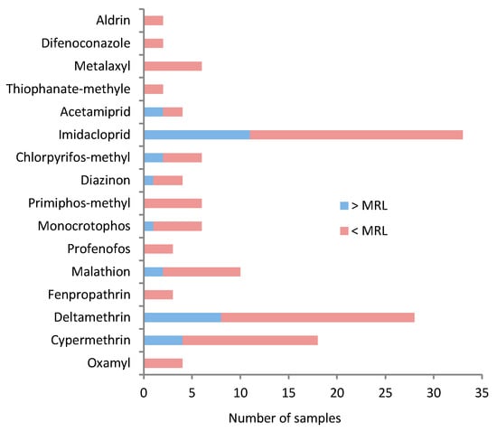 A total of 32 samples (21%) contained pesticide residue above the MRLs, whereas 56 samples (37%) contained pesticide residue at or below the MRLs established by Codex []. The percentage of contaminated samples was high for all of the vegetables except for carrot, zucchini, and cabbage. Tomato (88%), bell pepper (83%), and cucumber (87%) had the highest number of contaminated samples. No pesticide residues were detected in any of the potato samples. Only 17% of the zucchini samples, 10% of the carrot samples, and 7% of the cabbage samples were contaminated, and the residue levels in these vegetables were all below the MRLs set by Codex (Table 2). All of the fruit samples had a percentage of contaminated samples above 65%: strawberry (70%); grapes (86%); apples (90%), and; watermelon (83%). Tomato (19%), watermelon (50%), apple (80%), grapes (50%), and strawberry (40%) recorded the highest number of samples that exceeded the MRLs (Table 2).