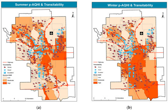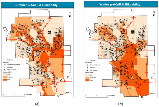 | Summer AQHI | Winter AQHI | Total Pop | Age 0–14 | Age 15–18 | Walkability | Bikability | Transitability | |