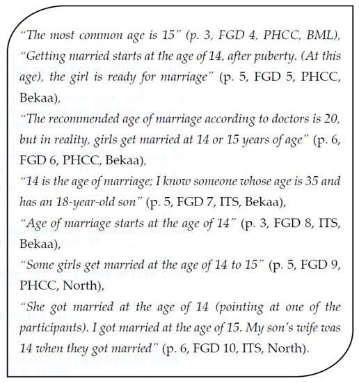 Quotes about age of marriage from selected focus group discussions (FGD); PHCC: primary health care center; ITS: informal tented settlements.