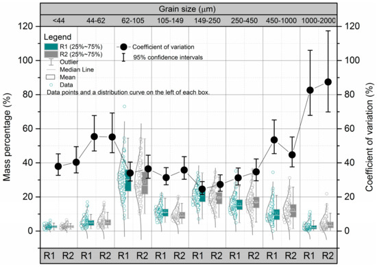 Grain-size heterogeneity in terms of the amounts present. Each Cv value shown is the mean ± the 95% confidence interval. R1 = areas in which there are main roads, R2 = residential areas.