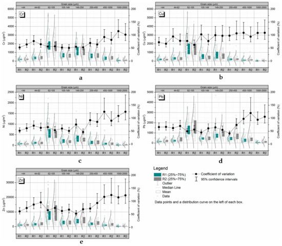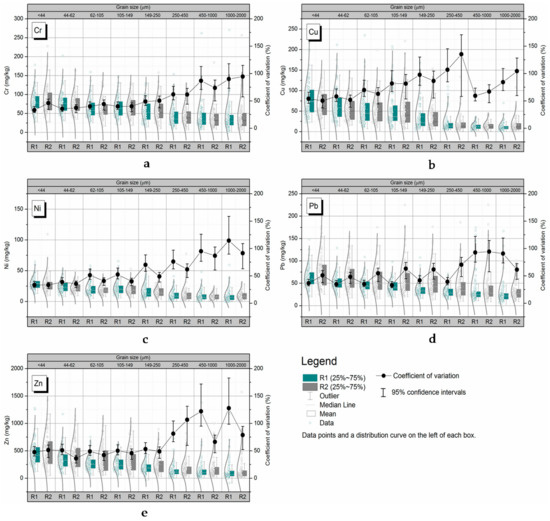 Grain-size heterogeneity in terms of metal concentrations present. Each Cv value shown is the mean ± the 95% confidence interval. R1 = areas in which there are main roads, R2 = residential areas; (a) grain-size variability in Cr concentrations; (b) grain-size variability in Cu concentrations; (c) grain-size variability in Ni concentrations; (d) grain-size variability in Pb concentrations; (e) grain-size variability in Zn concentrations.