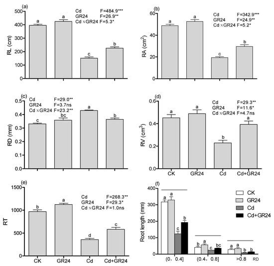 Cd treatment alone significantly reduced the RL, RA, RV and RT. However, supplementation with GR24 in seedlings treated with Cd markedly rescued the inhibition of the RL, RA, RV and RT (Figure 1a,b,d,e). Seedlings exposed to Cd caused an increase of 29.8% in RD (p < 0.05) (Figure 1c), while the root length in each section (0 < RD ≤ 0.4, 0.4 < RD ≤ 0.8, RD > 0.8) was markedly decreased as compared with control (Figure 1f). By contrast, application of GR24 together with Cd increased root length by 56.9 %, 50.8%, and 64.4 % in the following section (0 < RD ≤ 0.4, 0.4 < RD ≤ 0.8, RD > 0.8), respectively (Figure 1f). Addition of GR24 in basic solution has no effect on the root morphology. According to two-way ANOVA analysis, Cd, GR24 and their interaction significantly affected the RL and RA. Cd and GR24 significantly affected the RV and RT.