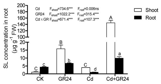 Effects of GR24 on the endogenous strigolactones in shoots and roots under Cd stress. Values are means ± SD (n = 3). Lower-case letters represent significant differences in roots; upper-case letters represent significant differences in shoots. Different letters above the bars indicate significant differences at the 0.05 level according to Duncan’s multiple range test. *p < 0.05, ** p < 0.01, *** p < 0.001. ns: not significant.