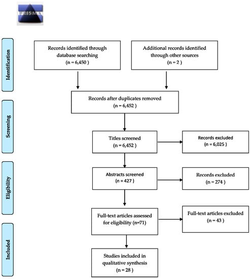 The study selection proceeded according to Preferred Reporting Items for Systematic Reviews and Meta-Analyses (PRISMA) guidelines. Of 6450 initially screened studies, 28 met final selection criteria for this review. All search results were exported to RefWorks. The papers were screened initially by title, contents of abstract, and then by contents of full text by one reviewer. The search terms returned both reviews and original research articles; reviews were excluded from this literature review. As such, the final selection of articles is a combination of literature retrieved from the initial search terms, from reviewing reference lists of selected articles and linked citations from newly published literature, though only 1 source was returned via hand selection (see Figure 1).