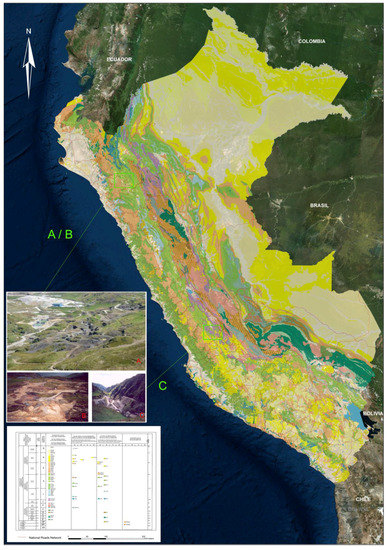 - Rodriguez, I.; Huanacuni, D.; Villarreal, E. Informe de las Franjas Metalogénicas y áreas Potenciales de la Región de Cajamarca; Instituto Geológico, Minero y Metalúrgico (INGEMMET): San Borja, Perú, 2011. [Google Scholar]