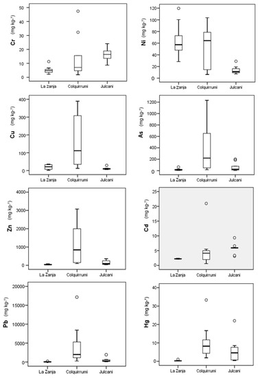 3.2.1. Box and Whisker Plots of Heavy Metal Concentrations in La Zanja, Colquirrumi and Julcani