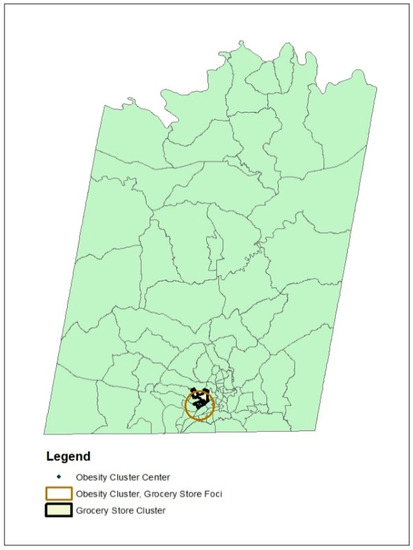 The Bernoulli scanning statistic was used to detect clusters of obese individuals with grocery store foci. The presence of such a cluster would suggest that living closer to a grocery store increases the likelihood of obesity. Results are also presented in Table 4. Only one significant cluster of obese individuals with grocery store foci was found (p-value < 0.001). The radius of this cluster is 1.48 miles, putting it well within the bounds of the 10-mile radius used by the United States Department of Agriculture (USDA) to define good access within more rural areas; although it is slightly larger than the 1-mile radius used for urban areas [15]. This statistic indicates there are a disproportionately high numbers of obese individuals within a region that would otherwise be characterized as having good access to a grocery store.